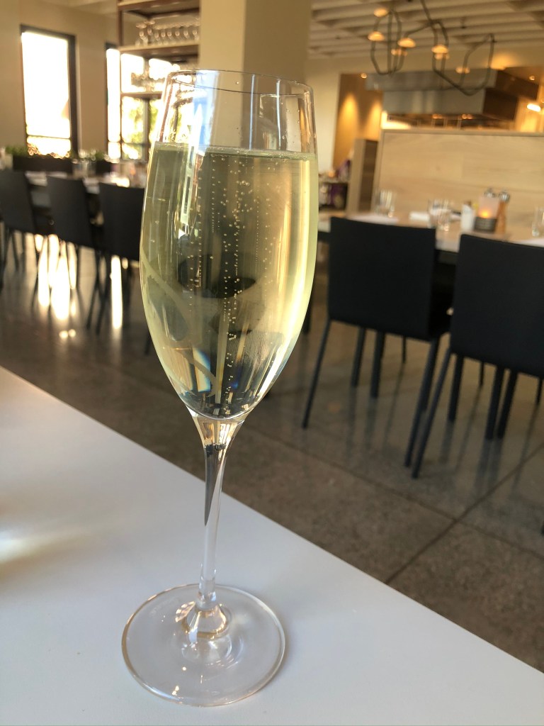 As soon as we arrived, we were greeted by a friendly and accommodating hostess. She sat us in Ian’s section. Ian is from Great Britain. Ian is still learning about the area’s award-winning wines from our region, so when I asked him for a recommendation on the wine, he sheepishly offered me a taste of anything I was interested in. No problem, I love honesty. I opted for a Processco, not my usual choice. I typically find them too sweet, but this one was light and mostly dry, with a little sweetness in the finish, yet not too sweet. It was very balanced. As I was waiting for my sparkling wine, I happened to notice that the underside of the table was covered in a soft, carpet-like material. I was blown away. This was a detail that not many would have even notices, but the designers went to a lot of expense, to do something so amazing. Have you ever seen such detail before? I had not, and it impressed the pants off me.