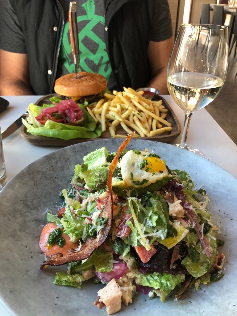 We had skipped breakfast this Sunday, so I was thrilled to see the menu for Brunch. There are enough items on the Brunch menu to satisfy any desires. The items go from sweet, French Toast, to savory, Double Smash Kobe Burger. I was impressed with the simplicity and range of the menu. Sometimes, brunch menus are too limiting or too overwhelming. This was the baby bear; it was just perfect. I brought along my husband, Danny. Truth be told, he was the one holding the gift certificate, so I am glad he brought ME along. Danny is a meat and potatoes man from Montana, so when he sees a “double-patty Kobe burger”, he doesn’t need to go any further on the menu. The burger was in the top three that he has ever ordered, he said. It was cooked perfectly. Without having to make you feel guilty for ordering fries instead of a salad with your burger, they automatically served the burger with truffle fries, which were double-fried, crisp, and light. They had a good selection of beer on tap, which he usually always orders, but he surprised me and ordered the Pinot Grigio. Whenever we go out to eat, Danny always has to keep me focused on the task at hand, selecting what I want to eat. It is very easy for me to look around the restaurant, talk to the staff, peruse the wine list long after I’ve made my selection, and it drives him crazy. When Ian came around to take our order, I hurriedly ordered the chopped salad. I can never go wrong with a chopped salad, but Piadina’s was awesome. The chopped chicken was perfectly cooked and the dressing was light and creamy. It was topped with a sunny-side-up quail egg. It was fantastic!